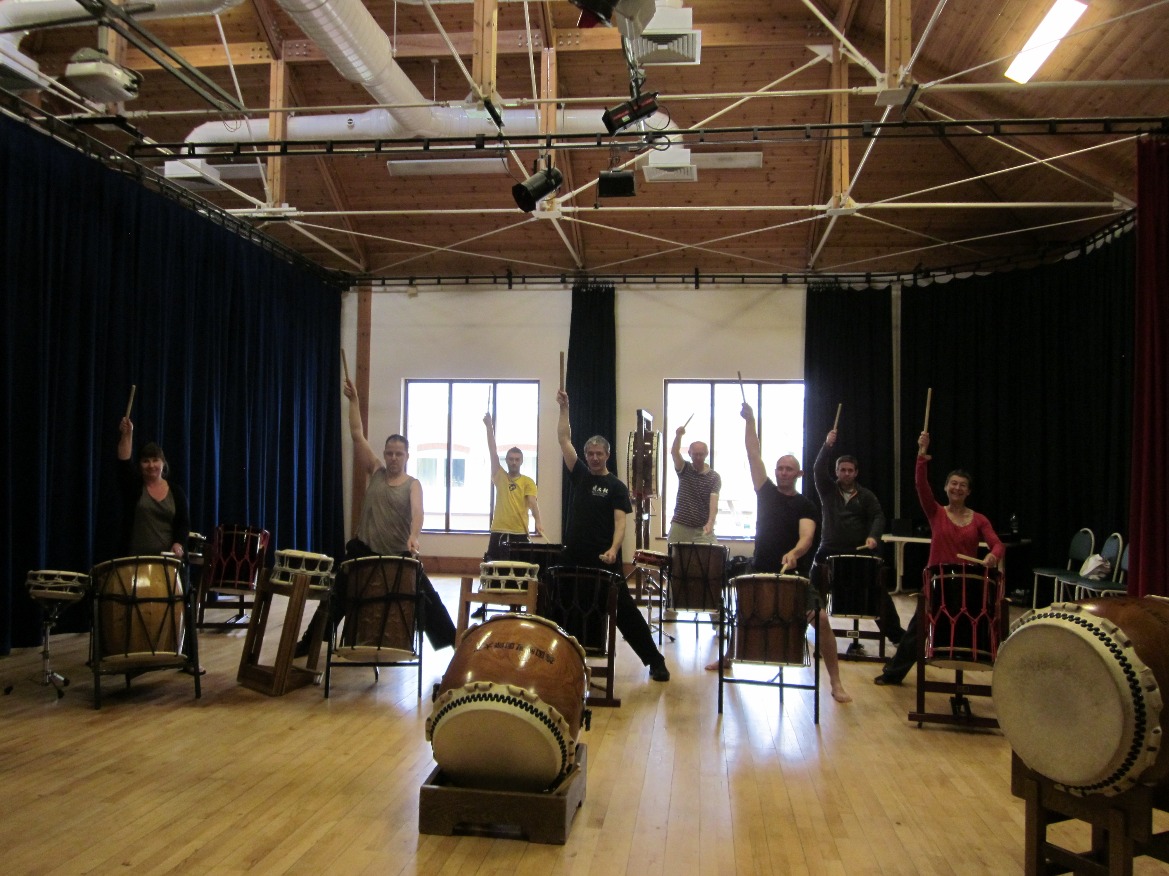 We offer a variety of introductory workshops for between 6-20 participants at a time.The content includes lots of drumming, with warm up exercises, an introduction to basic techniques, simple musical exercises and the opportunity to learn traditional or modern Taiko “songs”. These courses can be adapted to suit different groups and venues. For example: